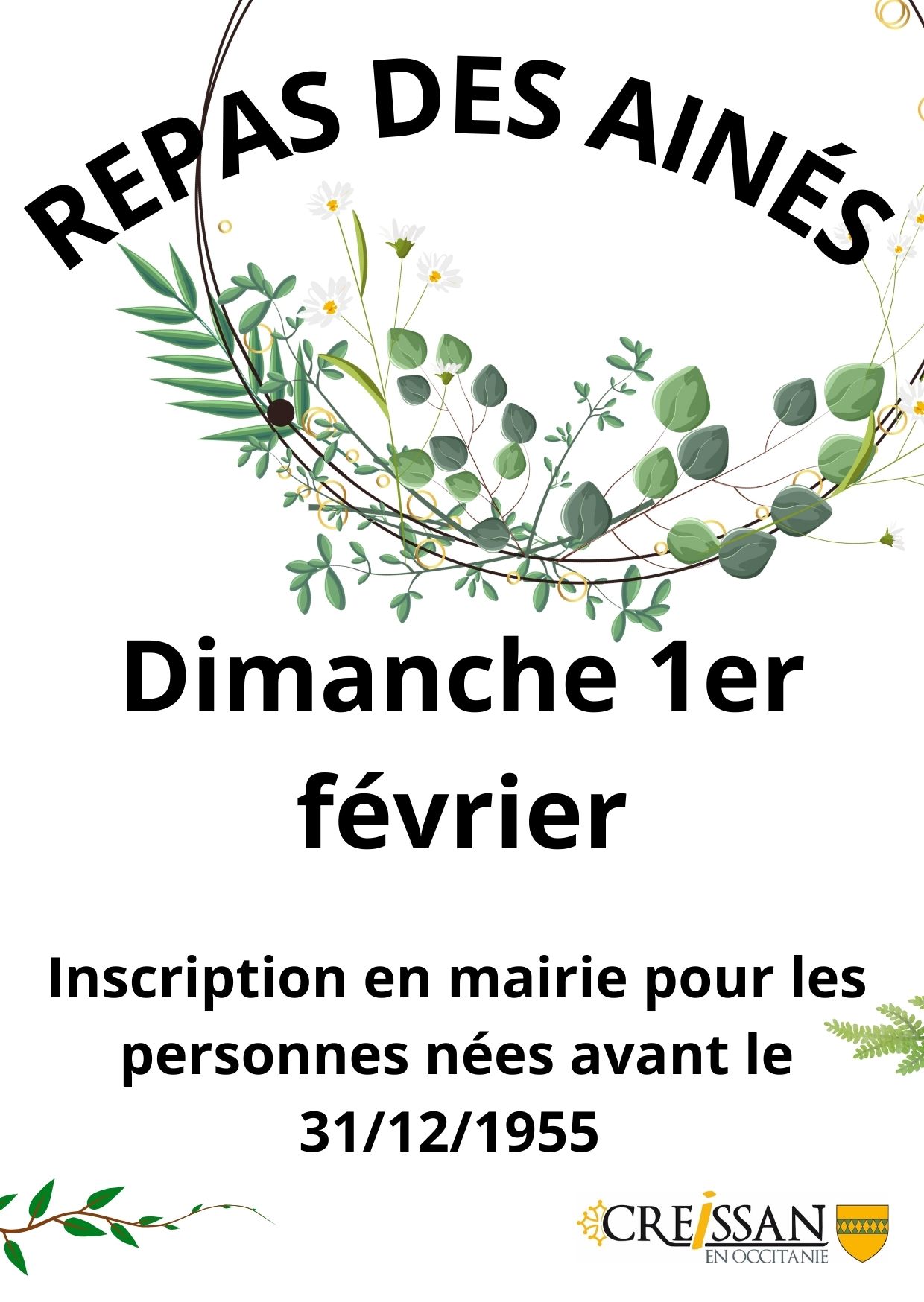 Repas des ainés Les personnes nées avant le 31/12/1953 sont invitées au déjeuner qui leur sera offert le Samedi 20 janvier 2024.Inscriptions en mairie avant le Lundi 15 janvier 2024. RSS Imprimer Facebook Twitter Linkedin