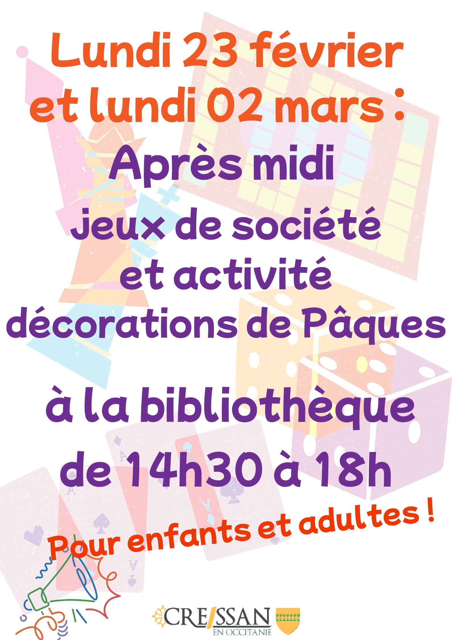 Durant les vacances de février, la bibliothèque municipale vous propose 2 après-midi jeux de société et activité décoration de Pâques pour...
