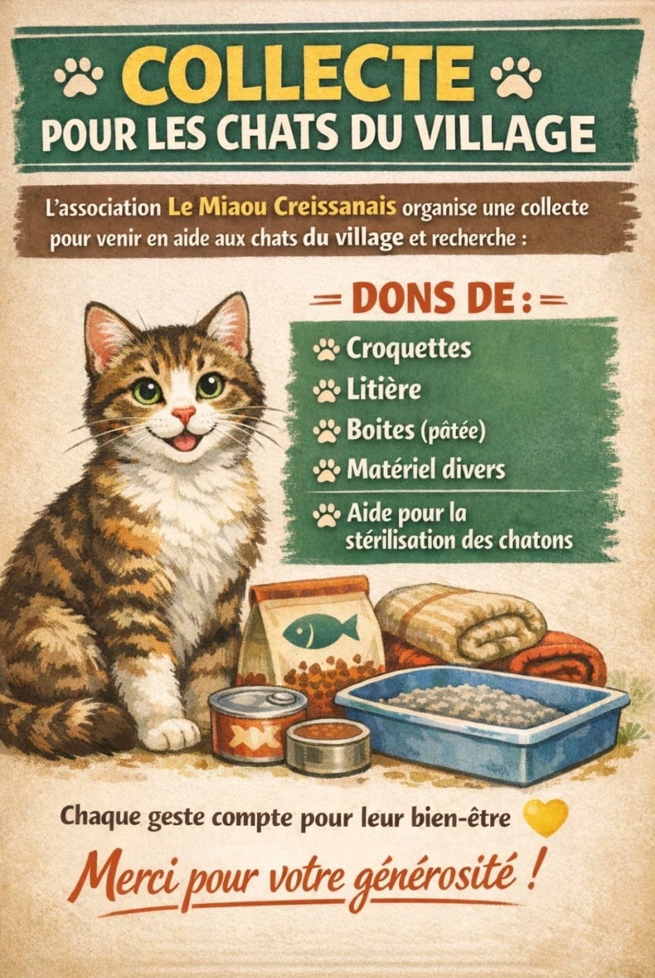 L'association Le Miaou Creissanais organise une collecte pour venir en aide aux chats du village.
