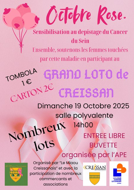 Dimanche 19 octobre : Grand Loto à l'occasion d'octobre rose organisé par le Miaou Creissanais, l'APE, la commune et la participations de nombreux commerçants à 14h00 à la salle polyvalente.