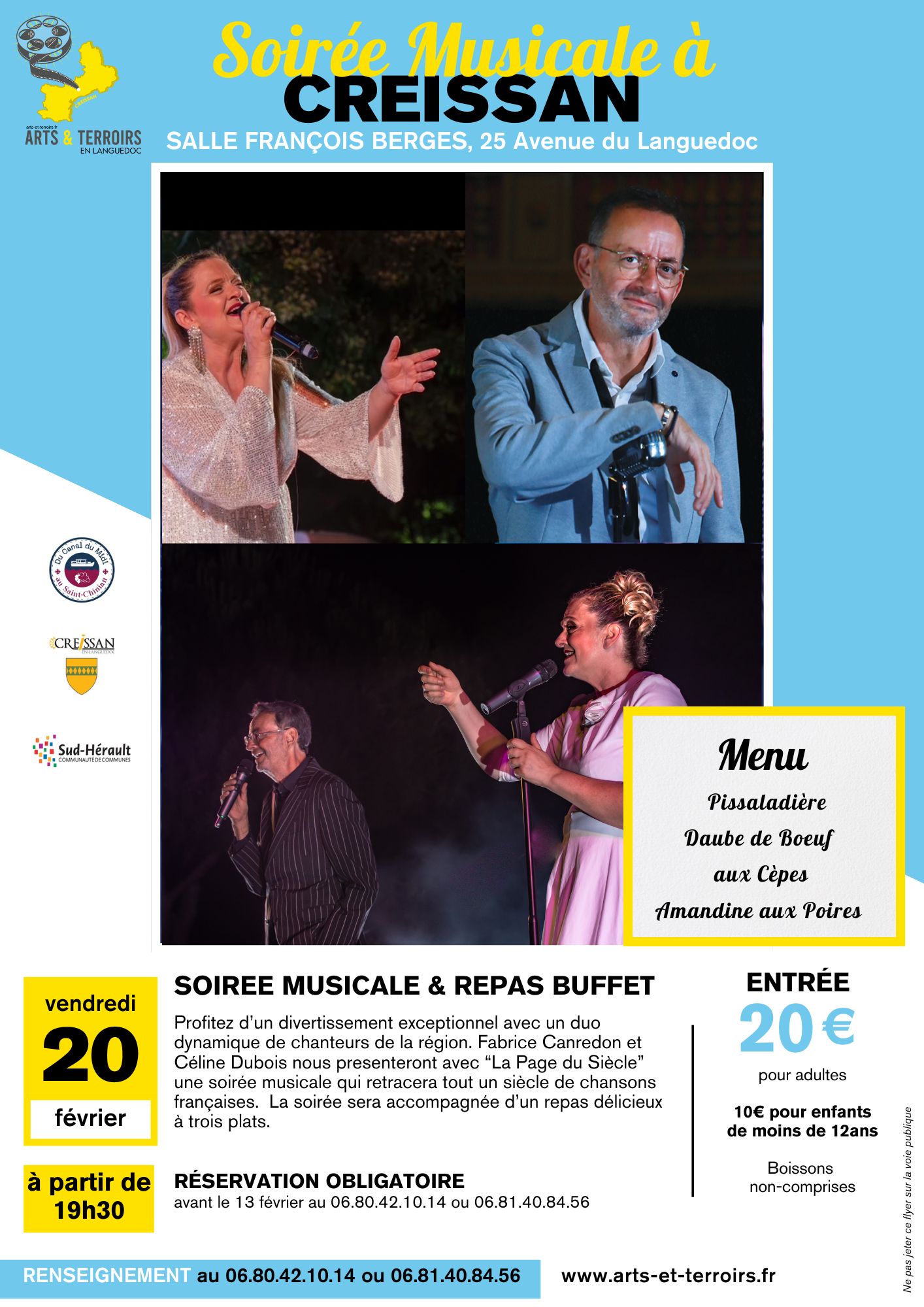 Samedi 20 février : Soirée musicale et repas buffet organisé par Arts et Terroirs en Languedoc à partir de 19h30 à la salle François...
